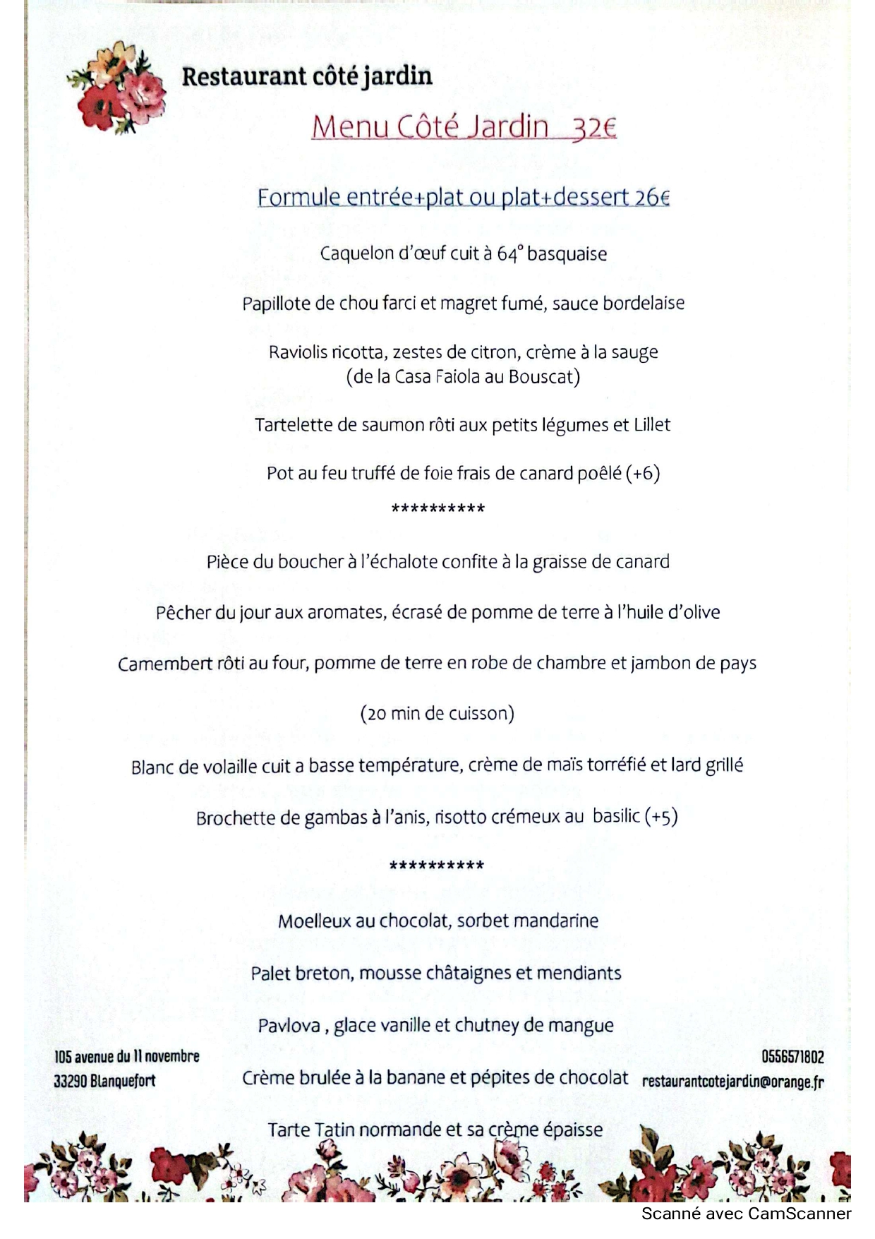 Mail : restaurantcotejardin@orange.fr